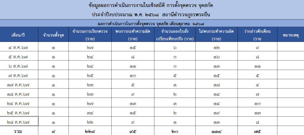 ข้อมูลผลการดำเนินงานในเชิงสถิติ การตั้งจุดตรวจ จุดสกัด ต.ค 67