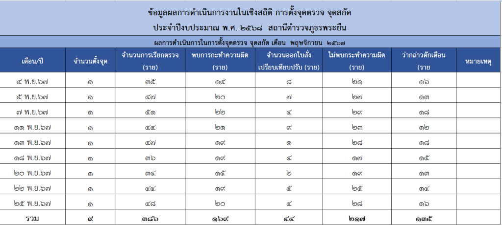 ข้อมูลผลการดำเนินงานในเชิงสถิติ การตั้งจุดตรวจ จุดสกัด พ.ย 67