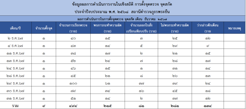ข้อมูลผลการดำเนินงานในเชิงสถิติ การตั้งจุดตรวจ จุดสกัด ธ.ค 67