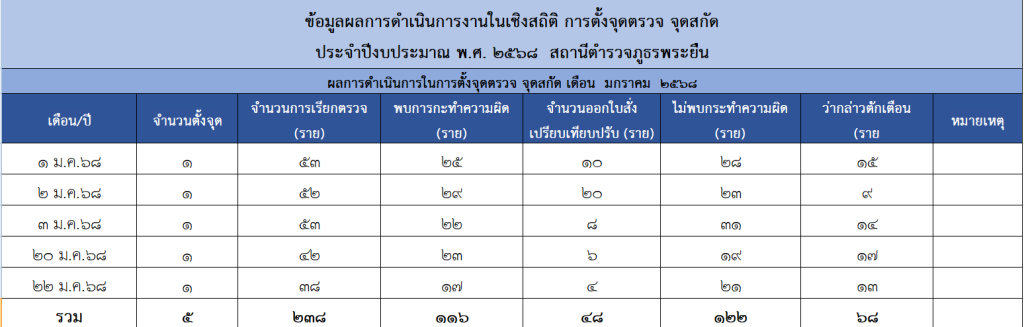 ข้อมูลผลการดำเนินงานในเชิงสถิติ การตั้งจุดตรวจ จุดสกัด ม.ค 68