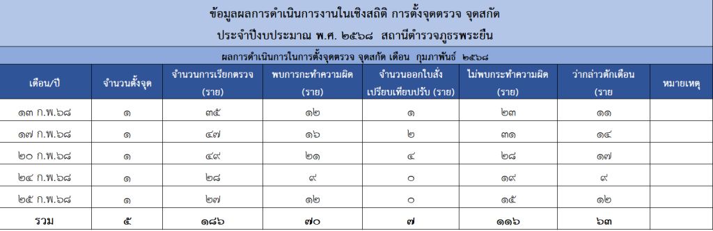 ข้อมูลผลการดำเนินงานในเชิงสถิติ การตั้งจุดตรวจ จุดสกัด ก.พ 68