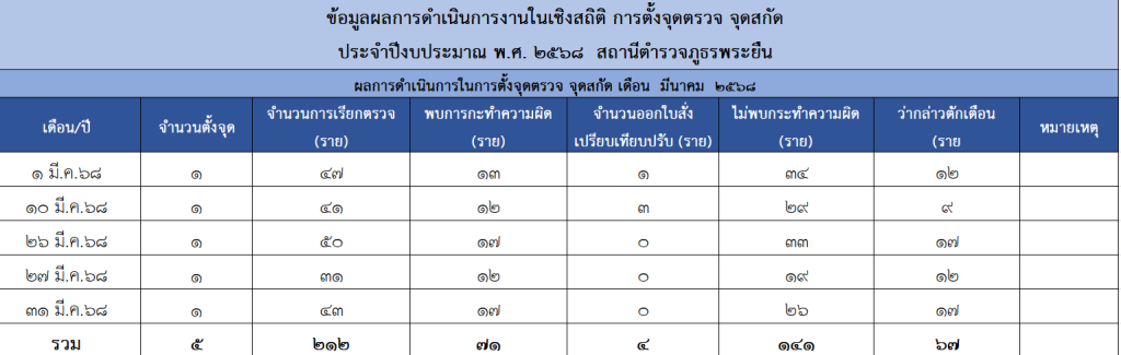 ข้อมูลผลการดำเนินงานในเชิงสถิติ การตั้งจุดตรวจ จุดสกัด มี.ค 68